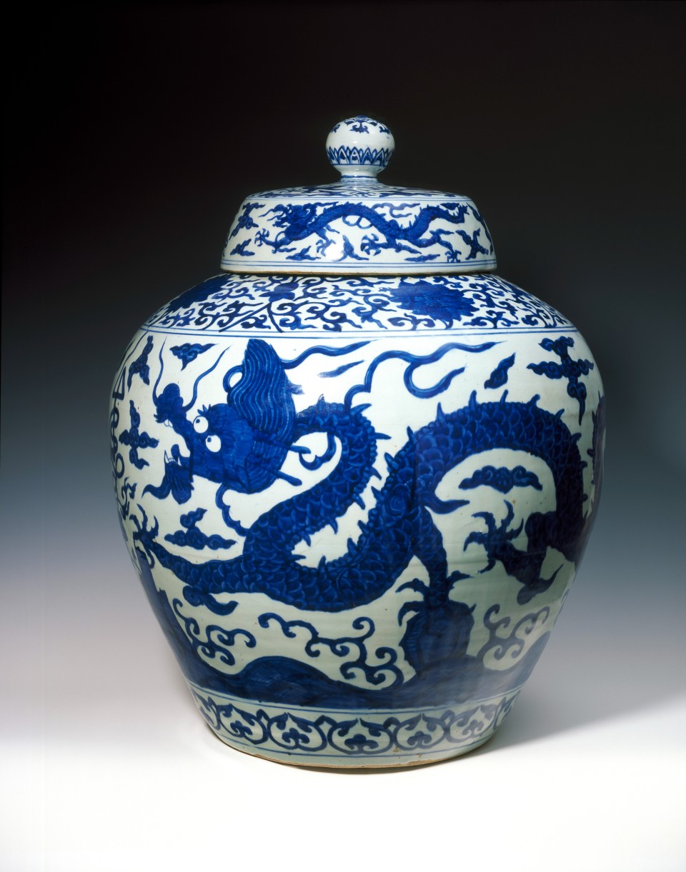 Of ovoid form with short straight neck and convex, unglazed base; the cover almost flat-topped, with knob handle. Painted in rich violet blue with round the sides two five-clawed dragons striding among clouds above rocks and waves, between 'shou 壽' (longevity) characters; with border of ruyi heads round the foot, and lotus scroll band encircling the shoulder. The main design is repeated on the sides and top of the cover.
