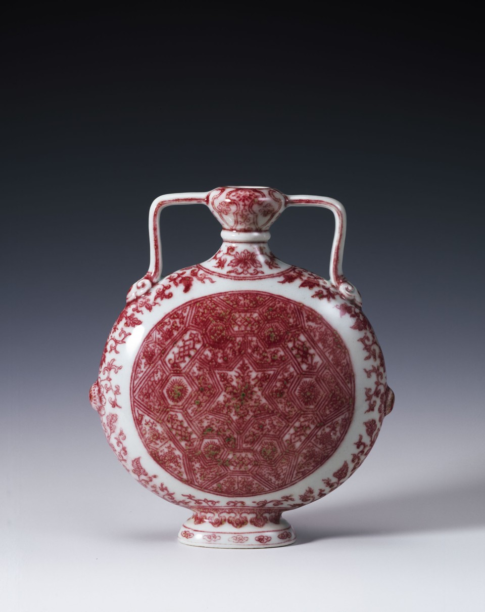 A "pilgrim's flask" of flattened circular form having a small neck with a collar, the sweling mouth with inturned lip joined to the shoulders by two angular strap handles terminating in ruyi heads, with an ornamental boss on either side below; oval, spreading foot. Painted in underglaze red turning to green in places is a roundel of intricate geometric design with a six-pointed star in the centre on either face, with formalised floral sprays repeating round the sides and neck, and pointed lappets with florets, etc. at the mouth and foot.