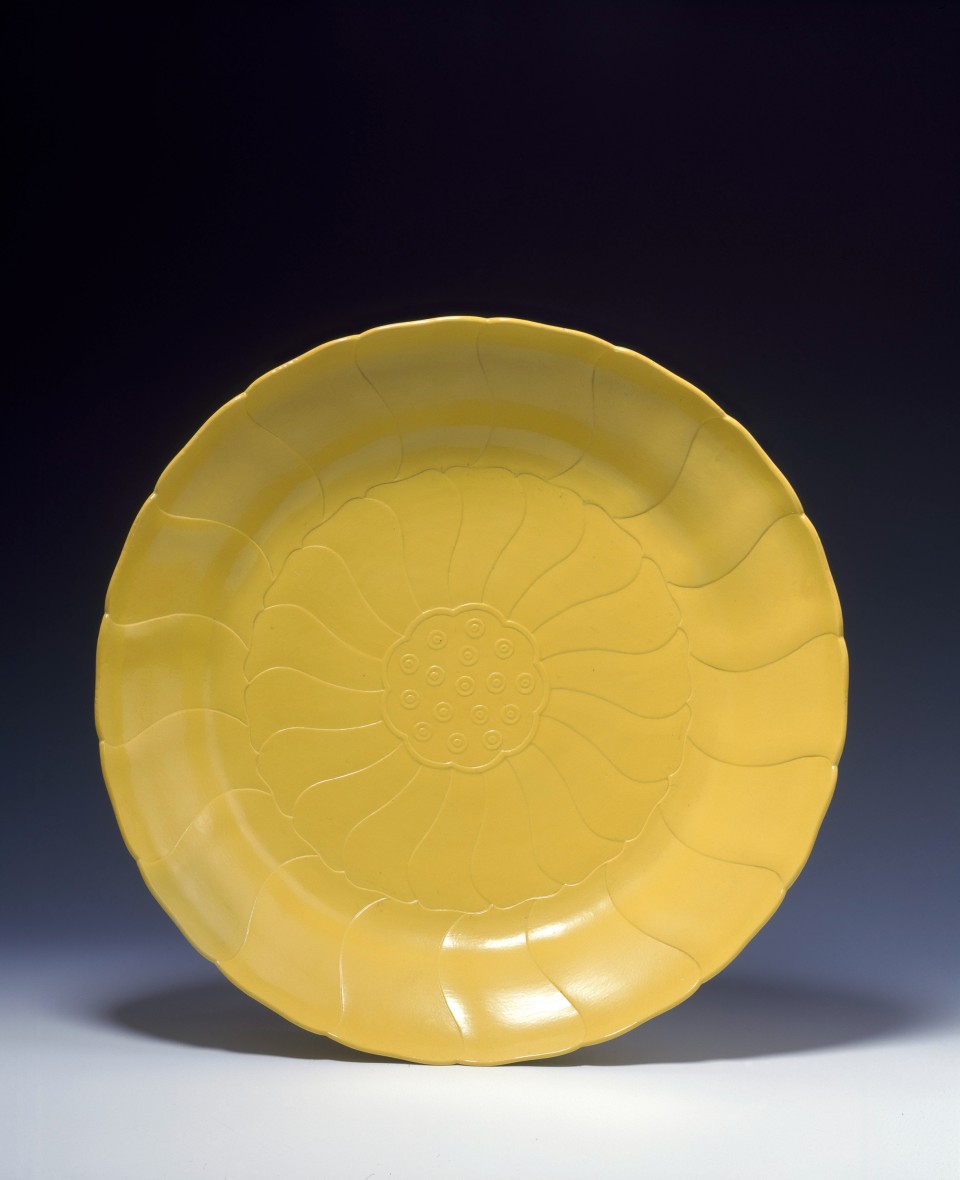 Yellow glazed dish (one of a pair) moulded in the shape of an open lotus flower with rounded, spreading sides hollowed slightly below the foliated rim. The inside showing two concentric ranks of petals round the seed-pod in the centre; low, thinly potted foot ring. Both inside and outside are covered with a rich, opaque light lemon-yellow enamel having a slightly rippled surface; the foot rims are burnt orange-pink. This motif symbolises fertility and numerous offspring.