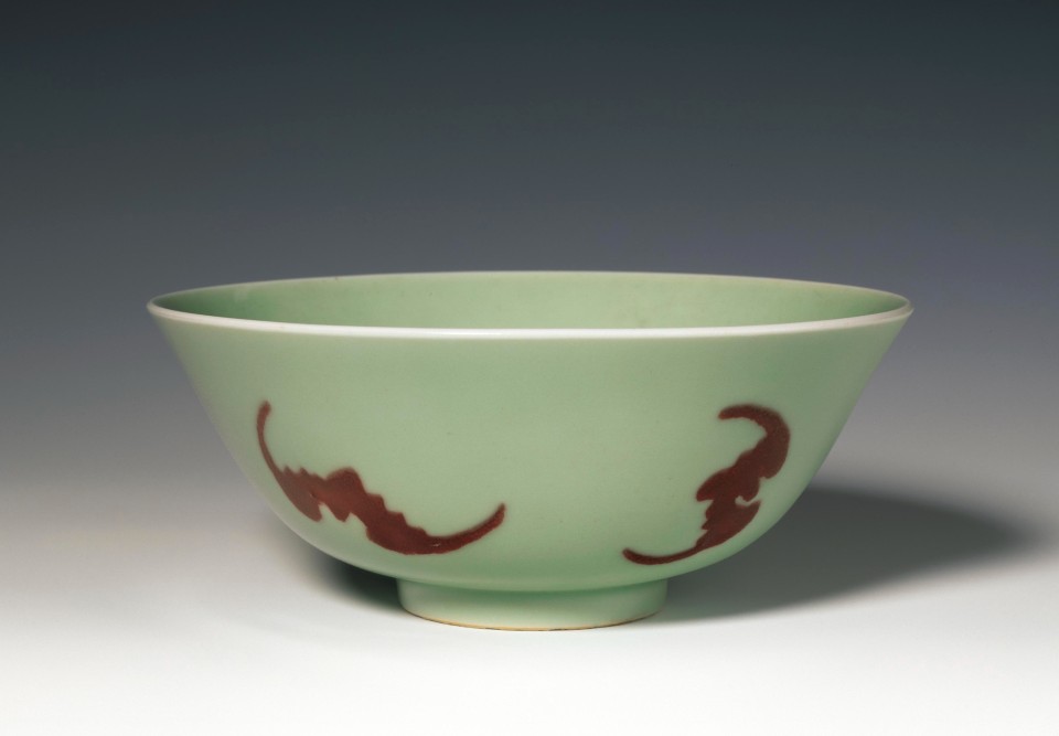 The bowl is covered with a fine pale celadon glaze, appearing in which on the outside are five bats executed in deep copper red. Five bats symbolise the five blisses: longevity, health, wealth, love of virtue and natural death.