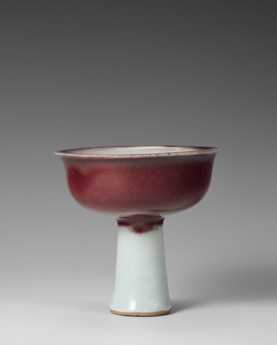 With shallow bowl and thin, everted lip, standing on a hollow stem spreading towards the foot. The glaze is of bluish-green tint except on the outside of the bowl where it is an uneven copper red, varying into brownish and greyish tones, that in part extends over the lip to the inside. The body appears orange on the foot and inside of the stem, round which is applied a ring of glaze.