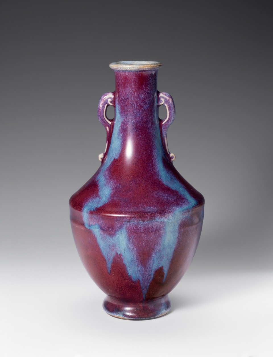 With rounded sides encircled by two shallow moulded ribs just below an angular shoulder, and tapering int the cylindrical neck, set on either side of which are a pair of handles shaped like stylized dragons; spreading mouth rim, and turned out foot. The outside is covered with a rich and lustrous copper-red glaze and the inside with a glaze of opaque greyish-blue, splashes of which are applied also to the outside, forming purplish transmutations with the red. On the base the glaze is a patchy olive-green and brown.