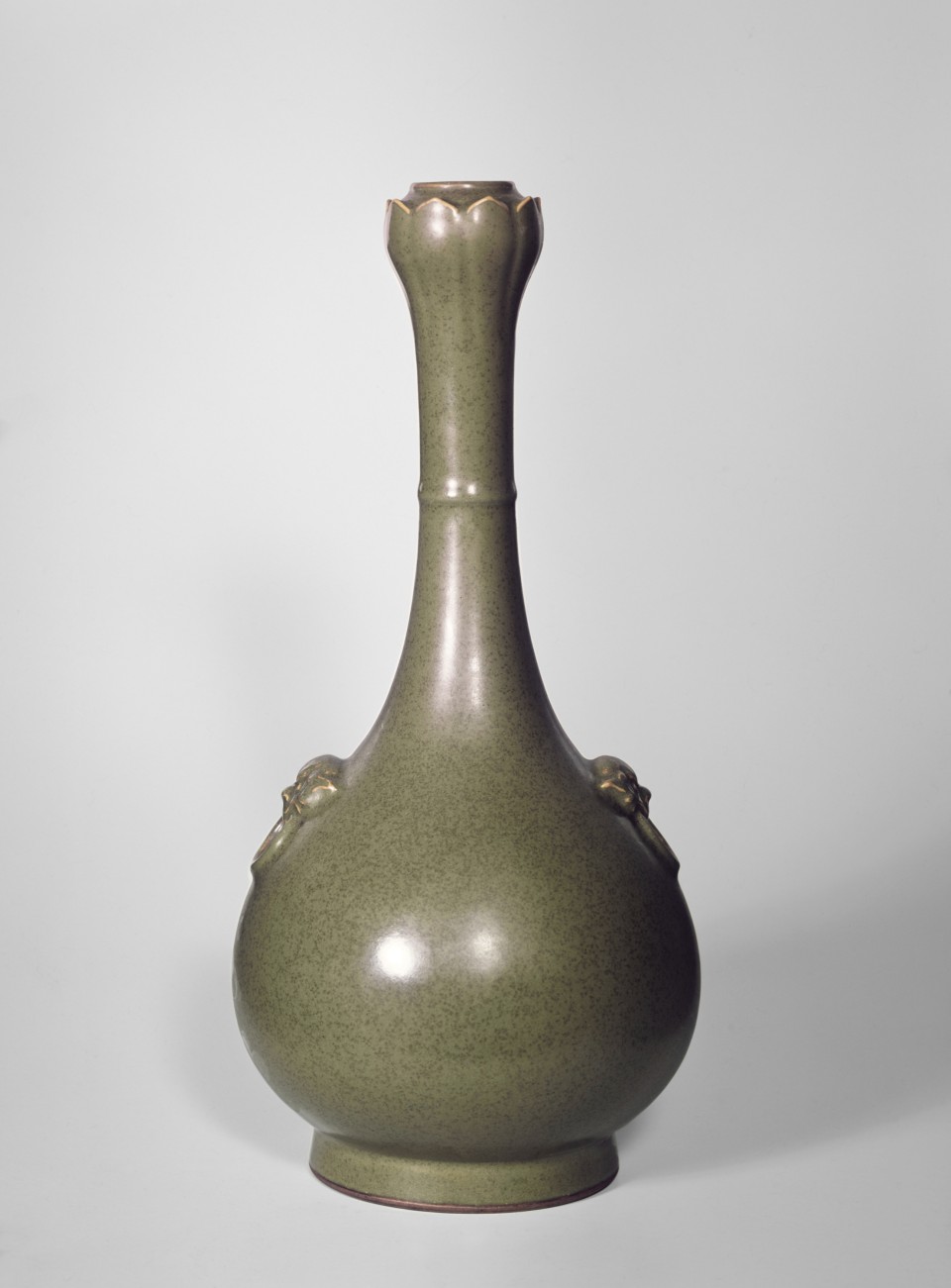 Of slender pear shape with tall, tapering tubular neck encircled by a moulded rib, and with a rounded mouth encased in nine moulded petals, like a lotus seed-pod. On either side of the body are animal masks with pendant rings in relief; somewhat spreading foot. The glaze, which also covers the base, is of a smooth, ochreous opaque olive-green showing darker flecks.