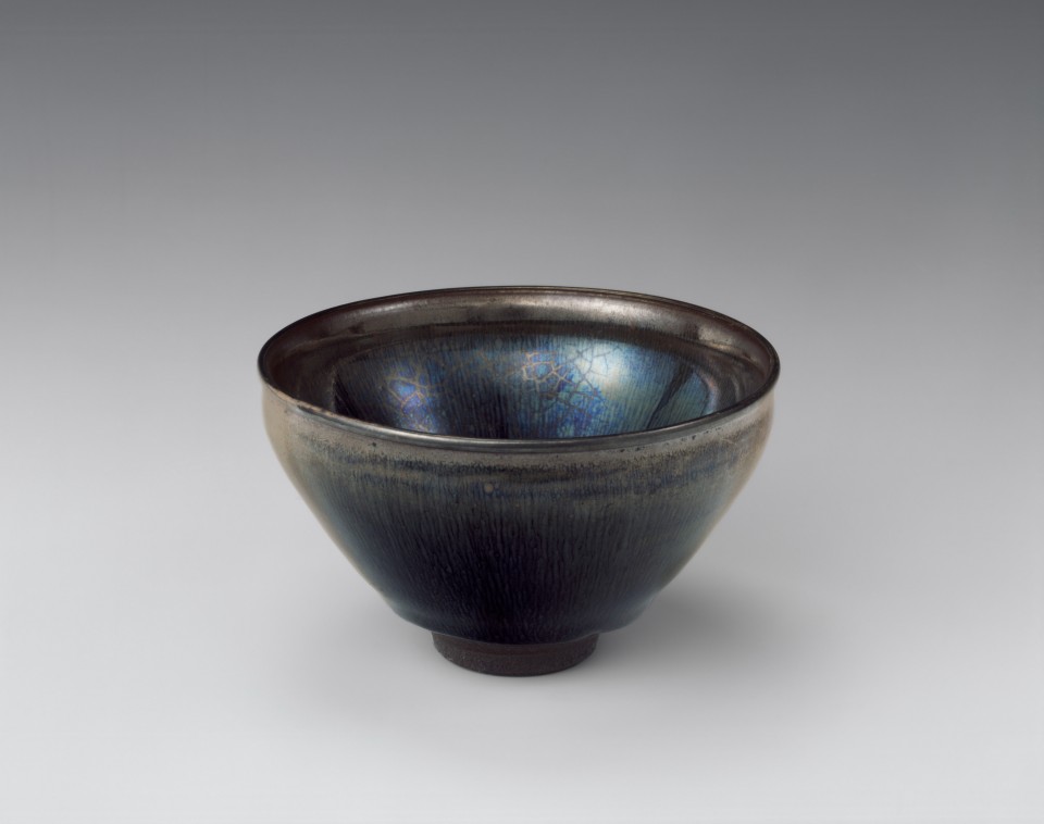 Jian ware bowl with iridescent markings conical, with a slight constriction below the rim, which is bound in a ring of silver; the sides pared round the foot. Coarse brown stoneware with a heavy, lustrous glaze of black streaked with fine brown markings inside and outside, and gathering in a thick roll above the foot. In reflected light the glaze reveals a striking blusih-green surface iridescence patterned with crackle lines.