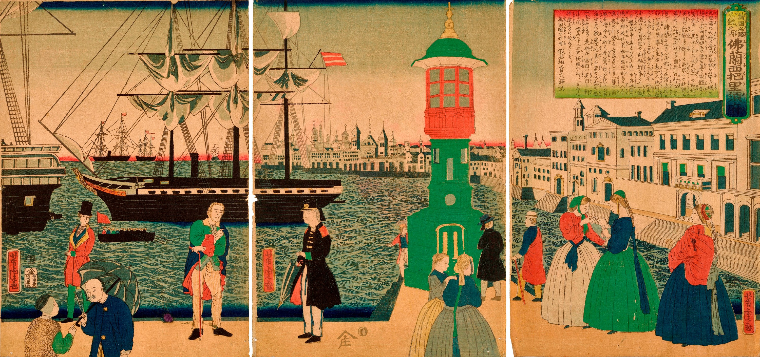 All these works date to between 1860 and 1890, three decades corresponding to the last years of the Edo period 江戸 (1603-1868) and the beginning of the Meiji era 明治 (1868-1912); this was a crucial time in the history of modern Japan, marked by profound political and social changes brought about, among other things, by the opening of the country to ideas and technology from the West. In the first part of the exhibition, the “Pictures of Yokohama” (Yokohama-e 横浜絵) illustrate the early phase of this encounter, with an emphasis on the Westerner. In the second part, the hashika-e 麻疹絵 (“images of measles”) reflect the hopes and fears of the population faced with a deadly epidemic of that disease in 1862. The exhibition ends with a presentation of the great print designer Tsukioka Yoshitoshi 月岡芳年 (1839-1892), whose career spanned the years between 1863 and 1892: deeply attached to the history and values of his country, he was also a hugely innovative and creative artist.