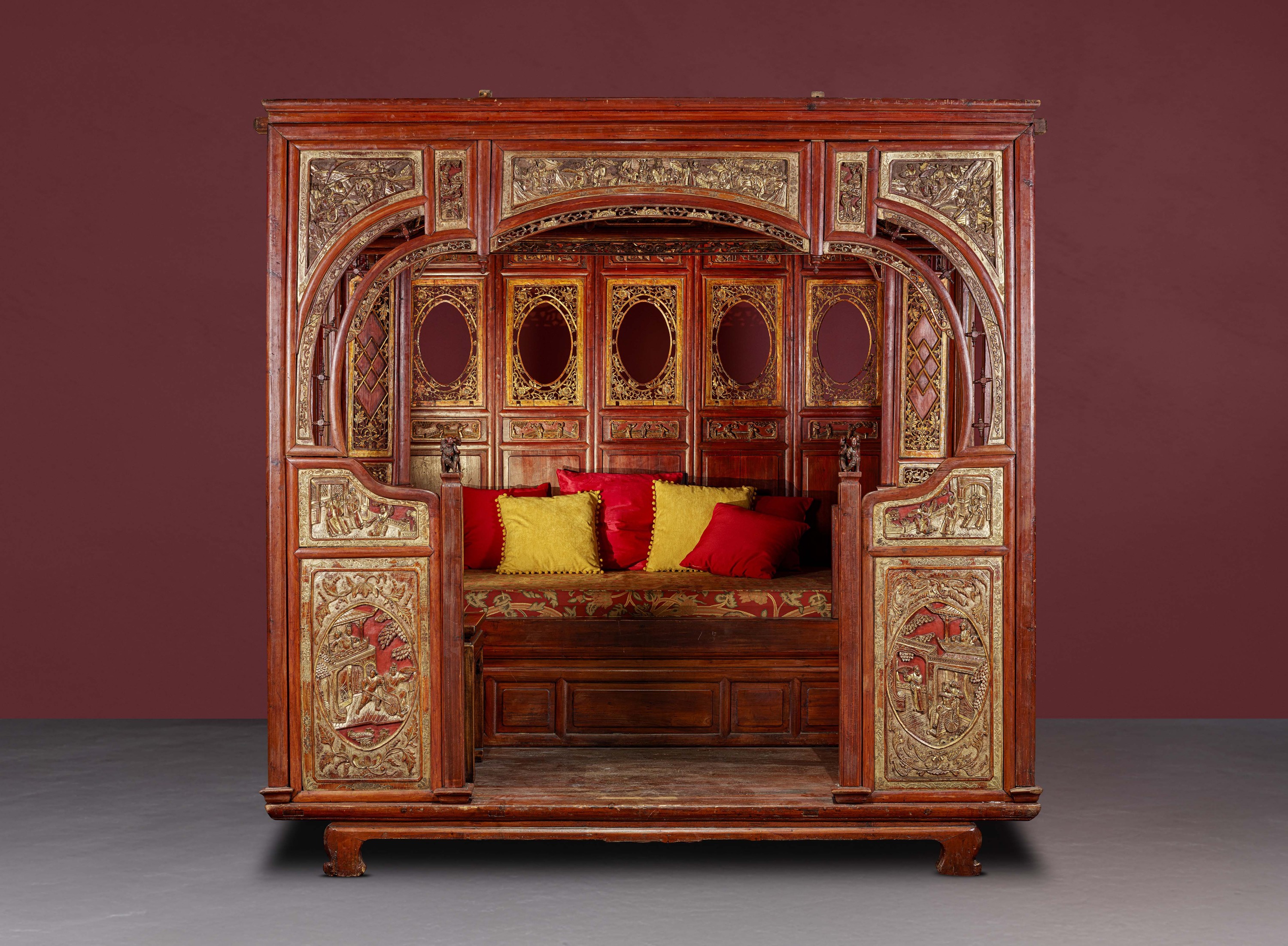 The second section is centred on a magnificent wedding bed of carved and gilded wood, symbolising that crucial moment in a person’s life that represents marriage. In a centuries-old patriarchal society, numerous decorative motifs relate to marital bliss, fertility, and the desire for male offspring. The importance of marriage, whether experienced as an obligation or as a happy union, is widely echoed in literature, notably through the well-known classic Story of the West Chamber (Xixiang ji 西廂記), frequently illustrated on ceramics.