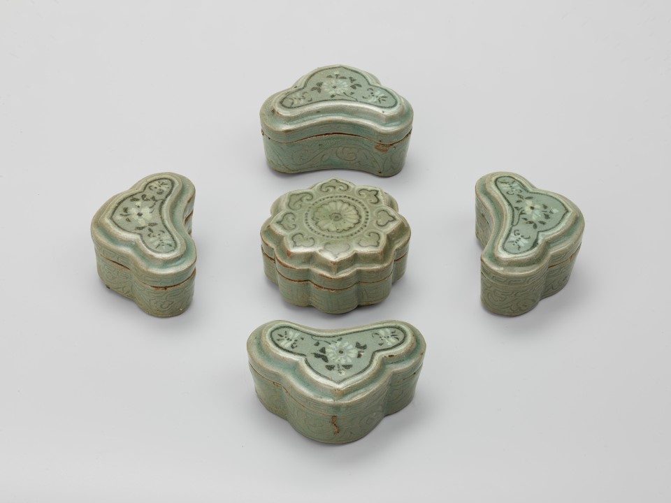 Of shallow, circular form with straight sides, and matching cover with flattened dome top; slight foot. It contains a nest of five smaller covered boxes, four of trefoil shape and one in the form of a rosette. Grey porcellanous stoneware with greyish-green celadon glaze which covers the interiors, feet, and bases on which remain patches of whitish firing-grit. The sides of the boxes are decorated with finely-incised key-fret and tendril-scroll patterns, and their tops with black and white inlaid designs. On the principal piece this consists of a central rosette ringed with cash pattern and a petal border with incised details. The central container figures a chrysanthemum head surrounded by cloud-collars; the others bear various flower sprays.
