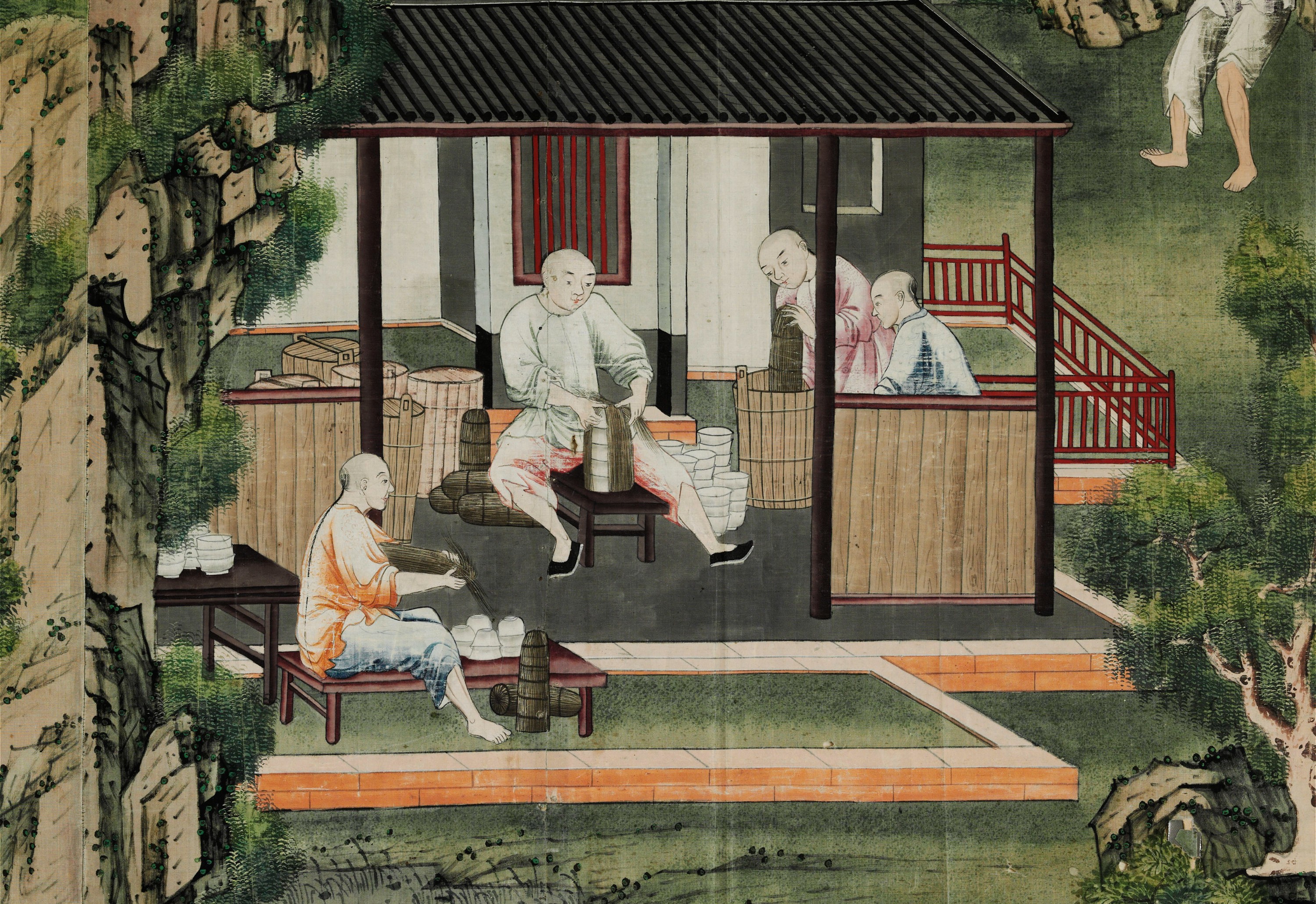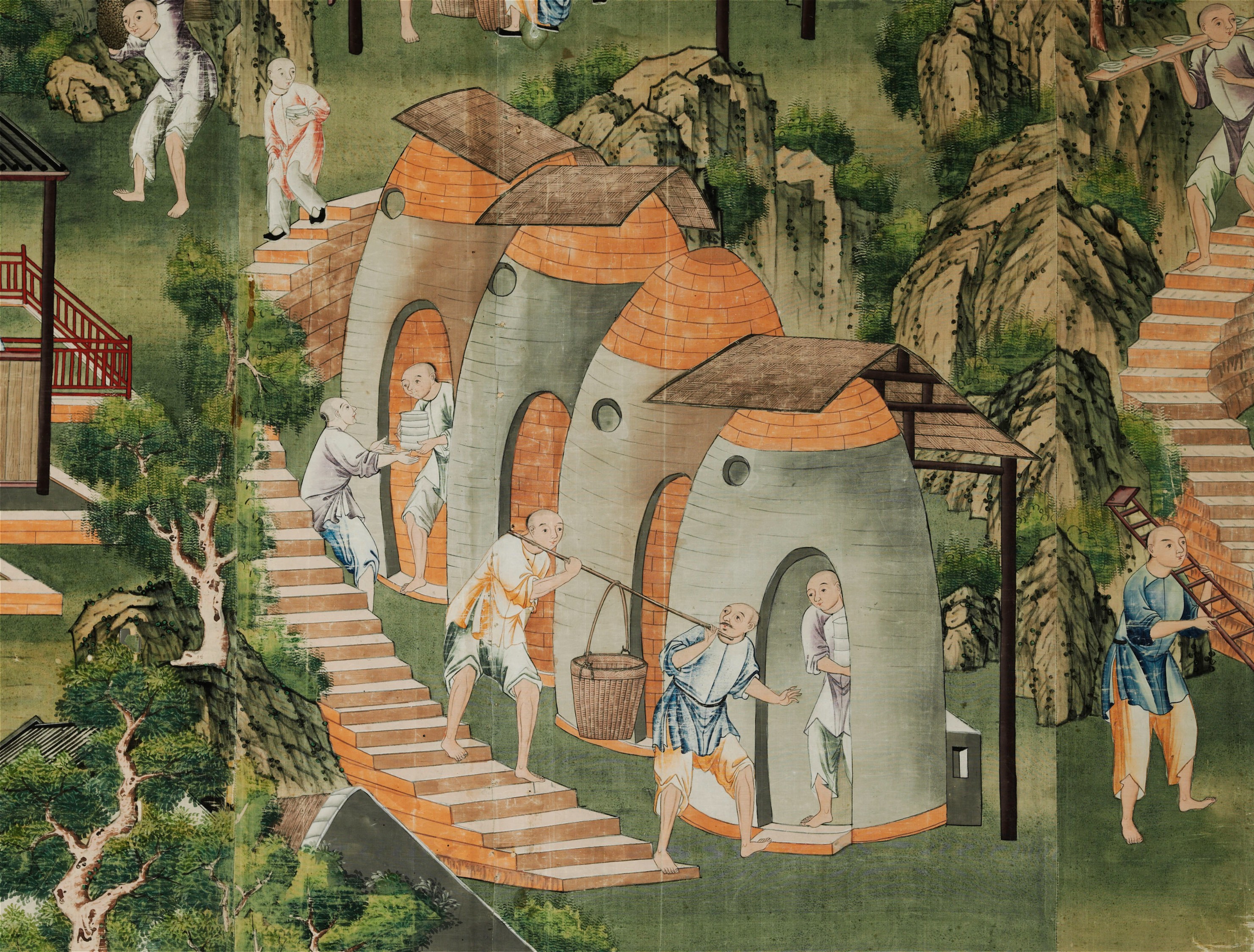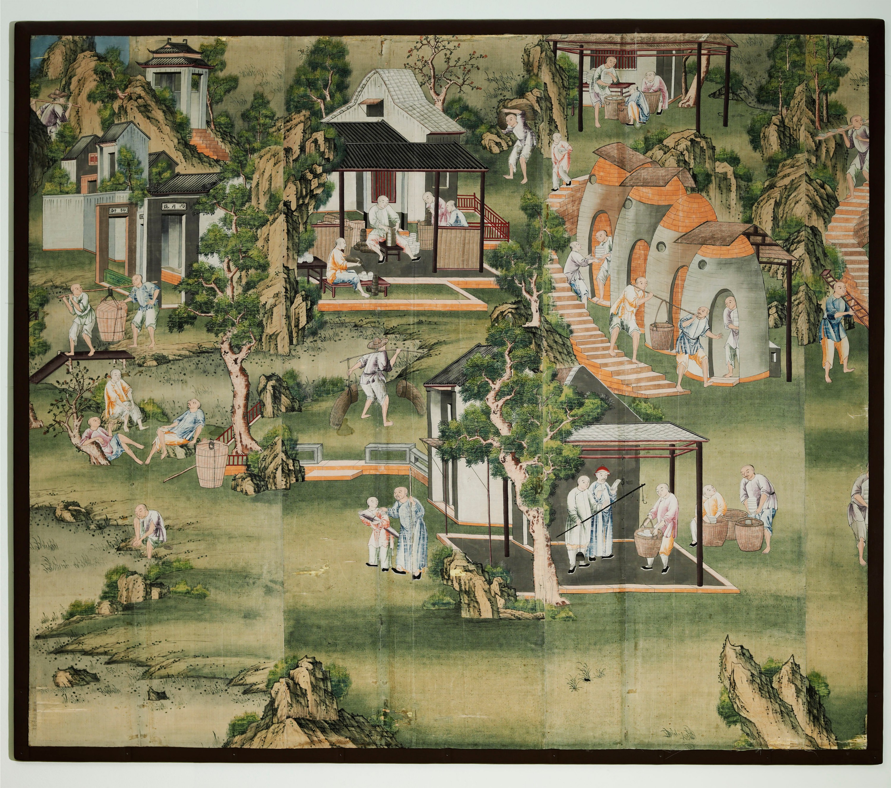 Tenture chinoise du XVIIIe siècle pour l’exportation, représentant des fours céramiques en pleine activité