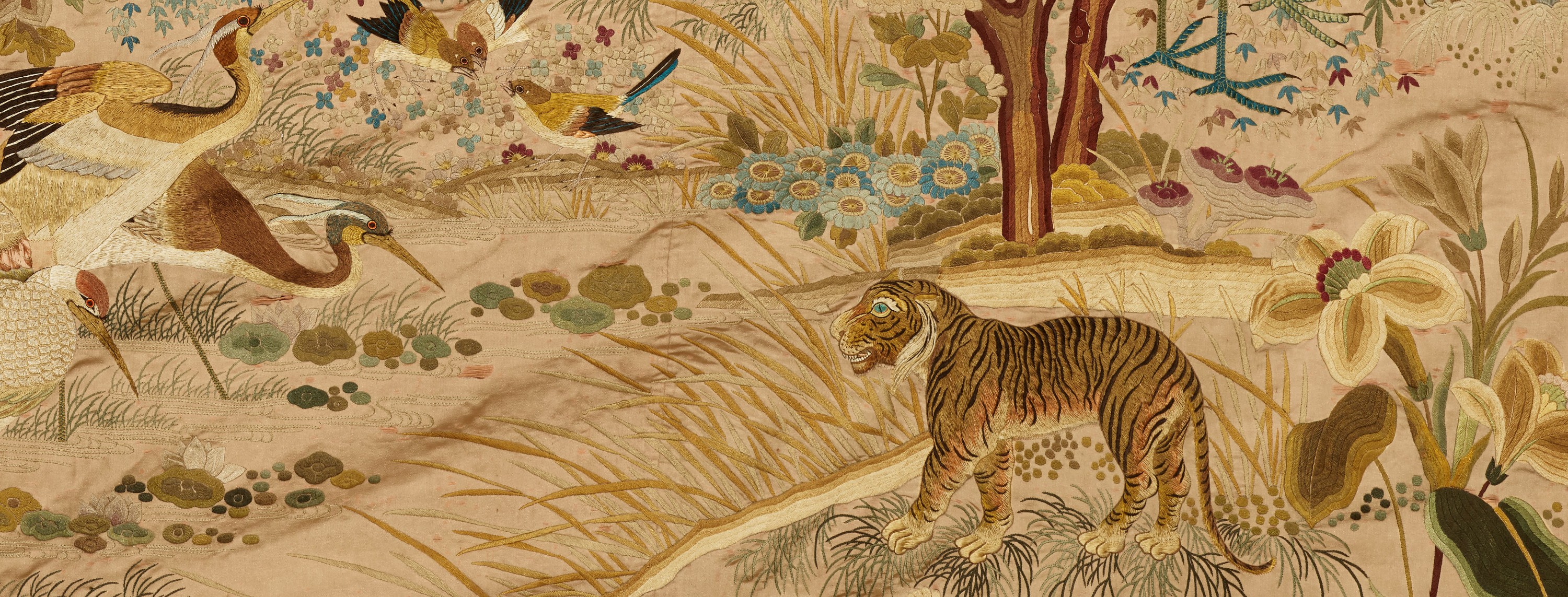Cette précieuse tenture, qui raconte aussi la création des trésors de la Fondation Baur, a été exposée de manière continue sur le mur du premier étage, et ce, dès l’ouverture du musée en 1964. La soie, cousue à même le support, souffrait d’usure, de la lumière et était surtout empoussiérée. Il était temps de faire restaurer cette pièce afin d’assurer sa pérennité.