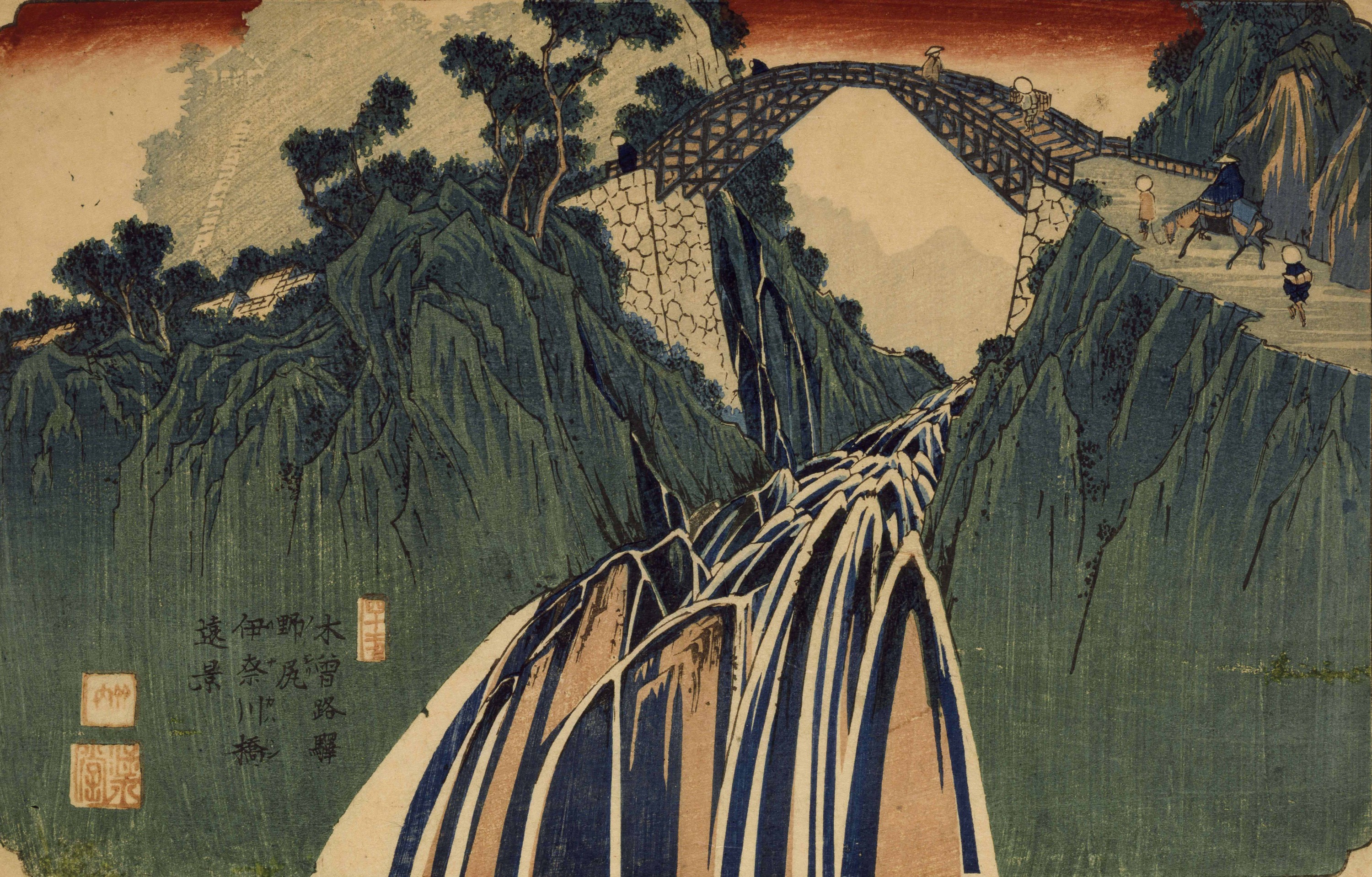Vue lointaine du pont Inagawa à Nojiri, de la série Soixante-neuf stations du Kisokaidô