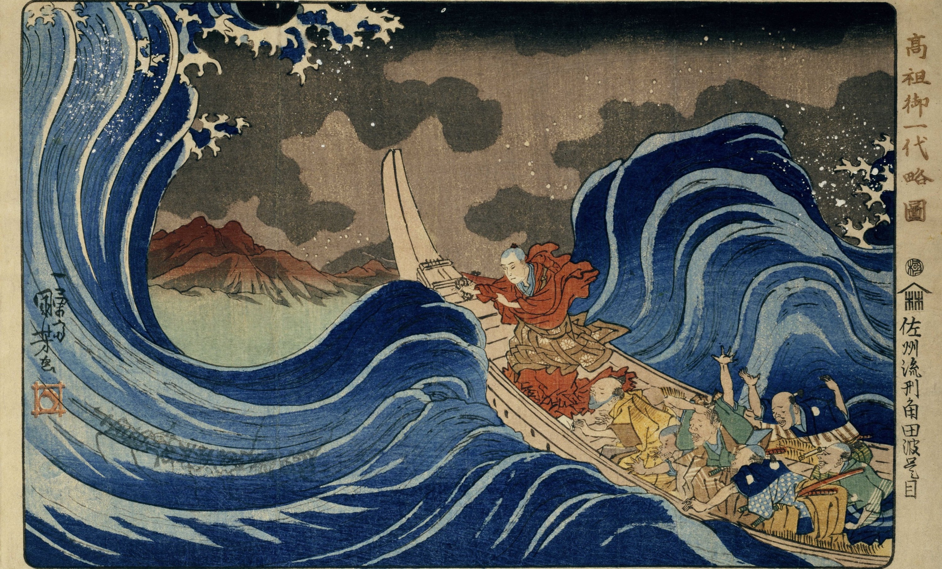 Nichiren calme les vagues en invoquant le Sutra du Lotus, de la série Biographie illustrée du moine Nichiren (1222-1282)