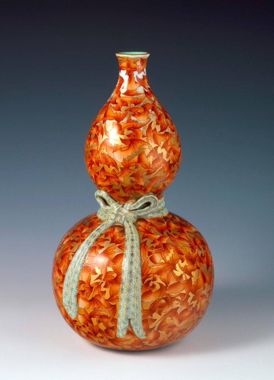 Ce vase en forme de calebasse porte un ruban imitant du brocart de soie noué entre les deux parties renflées de la gourde. Un tapis de chauves-souris rousses, voletant sur un fond d'or, recouvre presque entièrement la céramique. Un soin particulier a été apporté à la représentation de chaque animal pour qu'il soit unique.