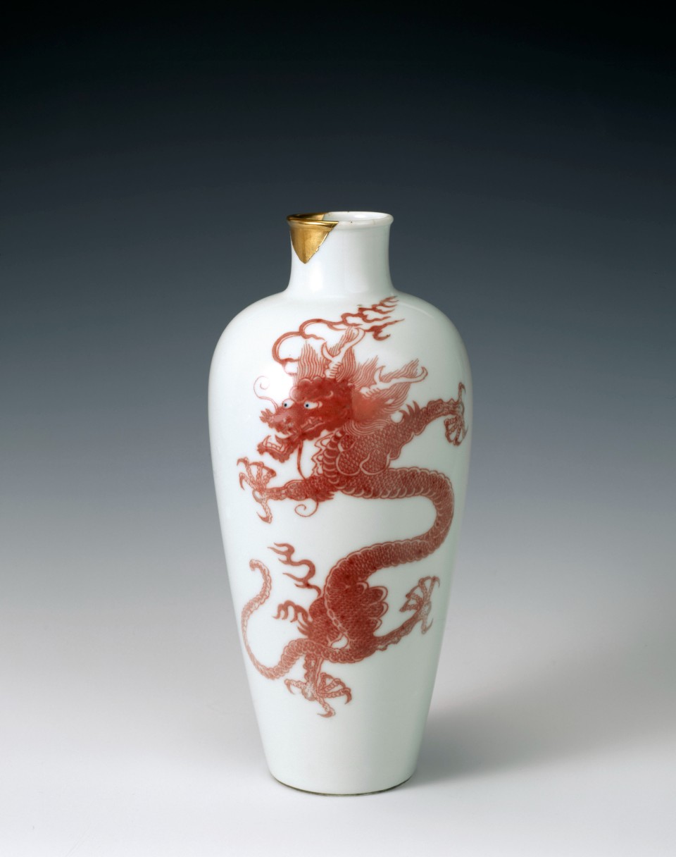De forme ovoïde allongée aux parois effilées, à l'épaule arrondie et au col cylindrique finement modelé avec un rebord plus épais, réparé à la laque d'or ; le pied est mince et la base est légèrement convexe. La couverte a une teinte verdâtre. De chaque côté est peint un dragon à écailles rampant, doté de cinq griffes et d'une queue fine, dans un rouge de cuivre profond, les yeux sont marqués d'une pointe de bleu sous couverte.