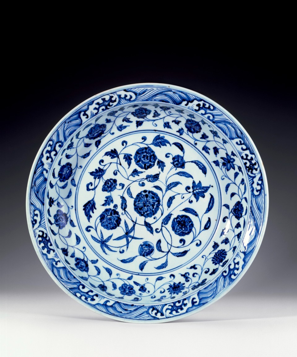 With rounded cavetto and flat rim thickened at the edge. Painted inside in the centre is a scrolling design bearing blooms of hibiscus, peony, and camellia, and round the cavetto is a continuous floral scroll with eleven blooms, included among which are lotus, chrysanthemum, camellia and peony; round the rim is a border of breaking waves. The outside is encircled by another floral scroll band with eleven blooms, differently arranged.