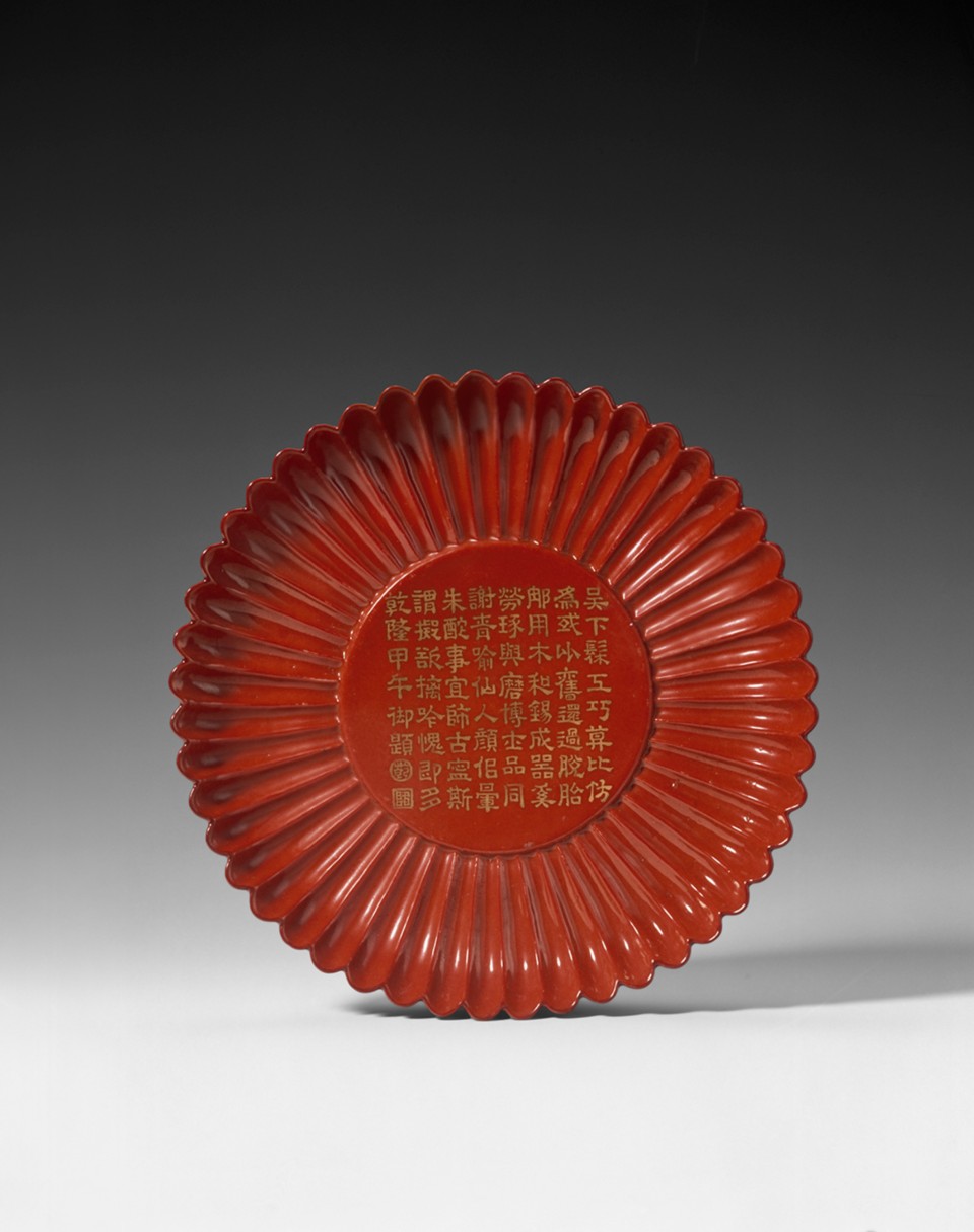 Une soucoupe peu profonde moulée en forme de fleur de chrysanthème ouverte, avec une bordure à pétales et un haut pied évasé également en forme de pétales finement ouvragé. L'intérieur et l'extérieur sont recouverts d'un émail rouge corail imitant la laque rouge, la base étant d'un noir lustré. À l'intérieur, au centre de la soucoupe, est inscrite en lettres dorées une inscription poétique de l'empereur Qianlong de cinquante-six caractères, que l'on peut traduire comme suit :