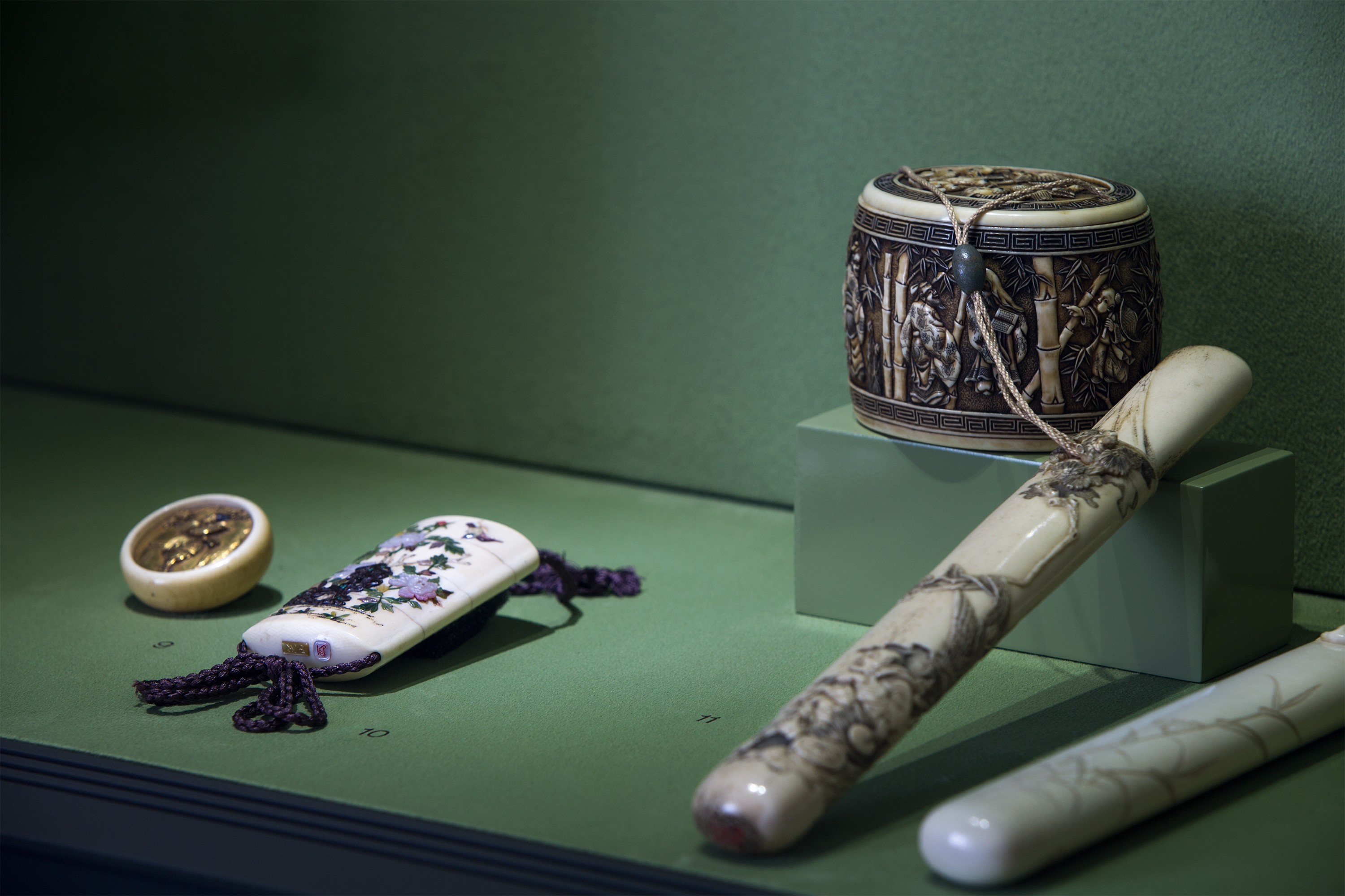 数の上ではそれほど多くはないが、芸術的な観点からは同じく重要なコレクションとして、鍋島焼、有田焼などの陶磁器、打敷(仏壇に飾る織物)、並河靖之(1845—1927)制作のものを中心とした明治七宝、煙管などの喫煙具が含まれる。